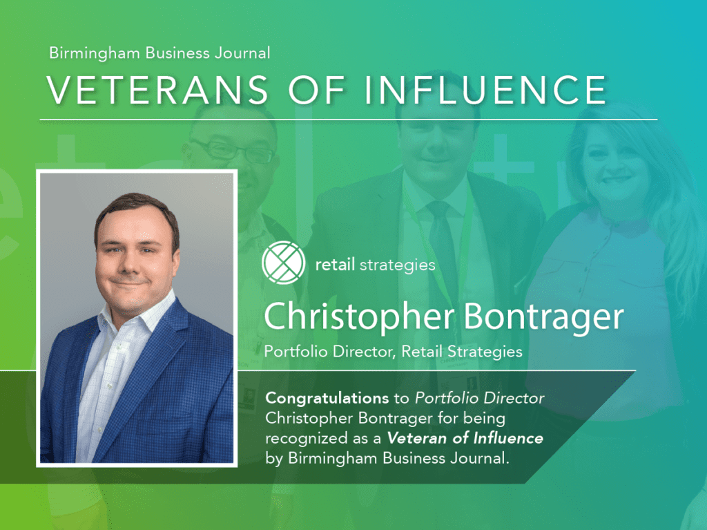 Christopher Bontrager, portfolio director at Retail Strategies, was named one of Birmingham Business Journal’s 2020 Veterans of Influence. In the special Veterans of Influence section, the BBJ recognizes military veterans who served their country before going on to have successful careers in Birmingham’s business world.