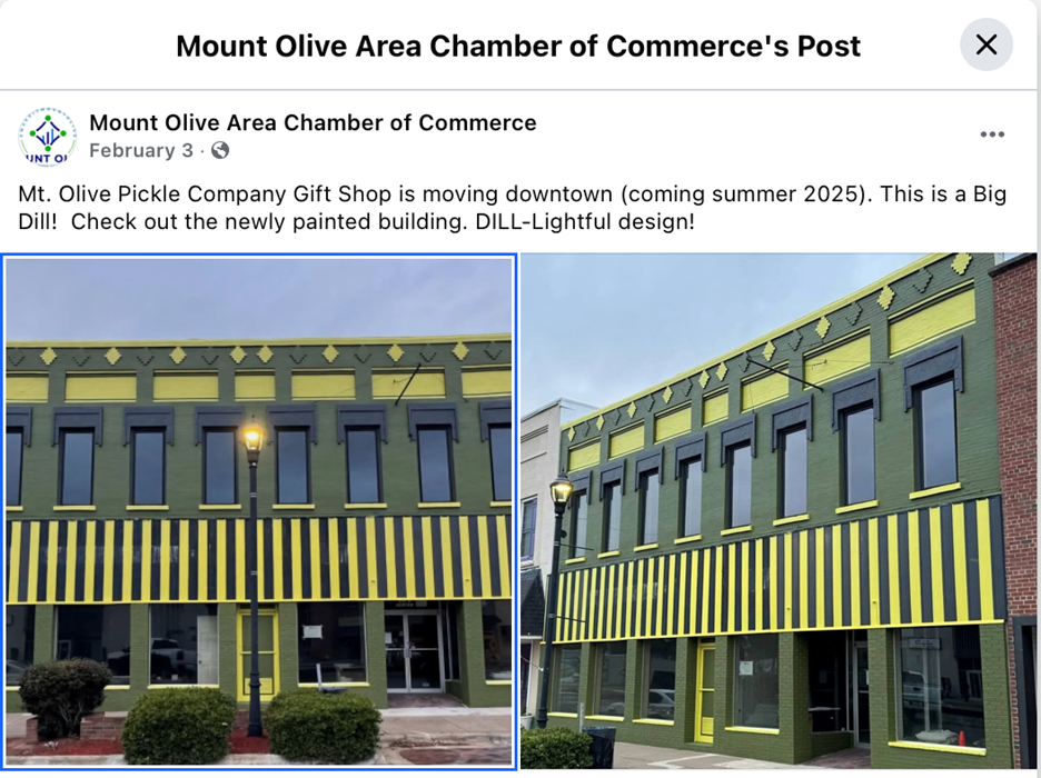 - Mt. Olive Pickles made the decision to relocate their gift shop from the factory to downtown. They are currently renovating a historic downtown building with plans to open in the summer of 2025.