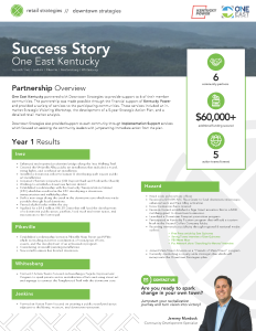 One East Kentucky partnered with Downtown Strategies to provide support to 6 of their member communities. The partnership was made possible through the financial support of Kentucky Power and provided a variety of services to the participating communities. These services included an in-market Strategic Visioning Workshop, the development of a 5-year Strategic Action Plan, and a detailed retail market analysis.