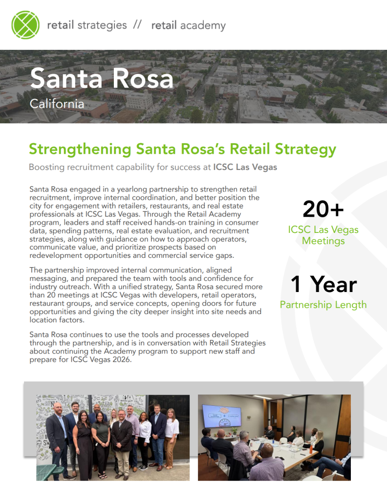Santa Rosa continues to use the tools and processes developed through the partnership, and is in conversation with Retail Strategies about continuing the Academy program to support new staff and prepare for ICSC Vegas 2026.